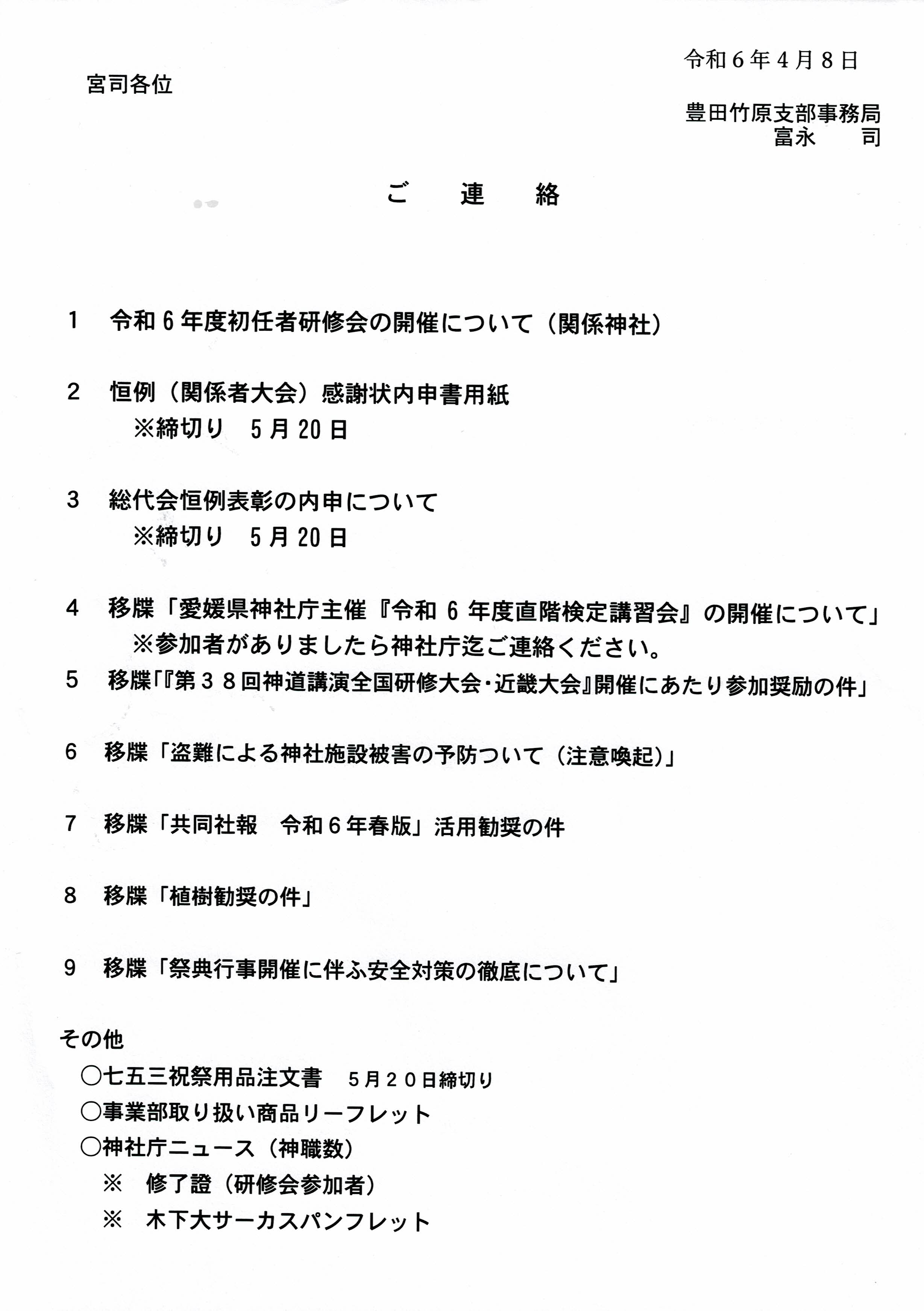 令和6年1月:神社庁例祭、新報購読料