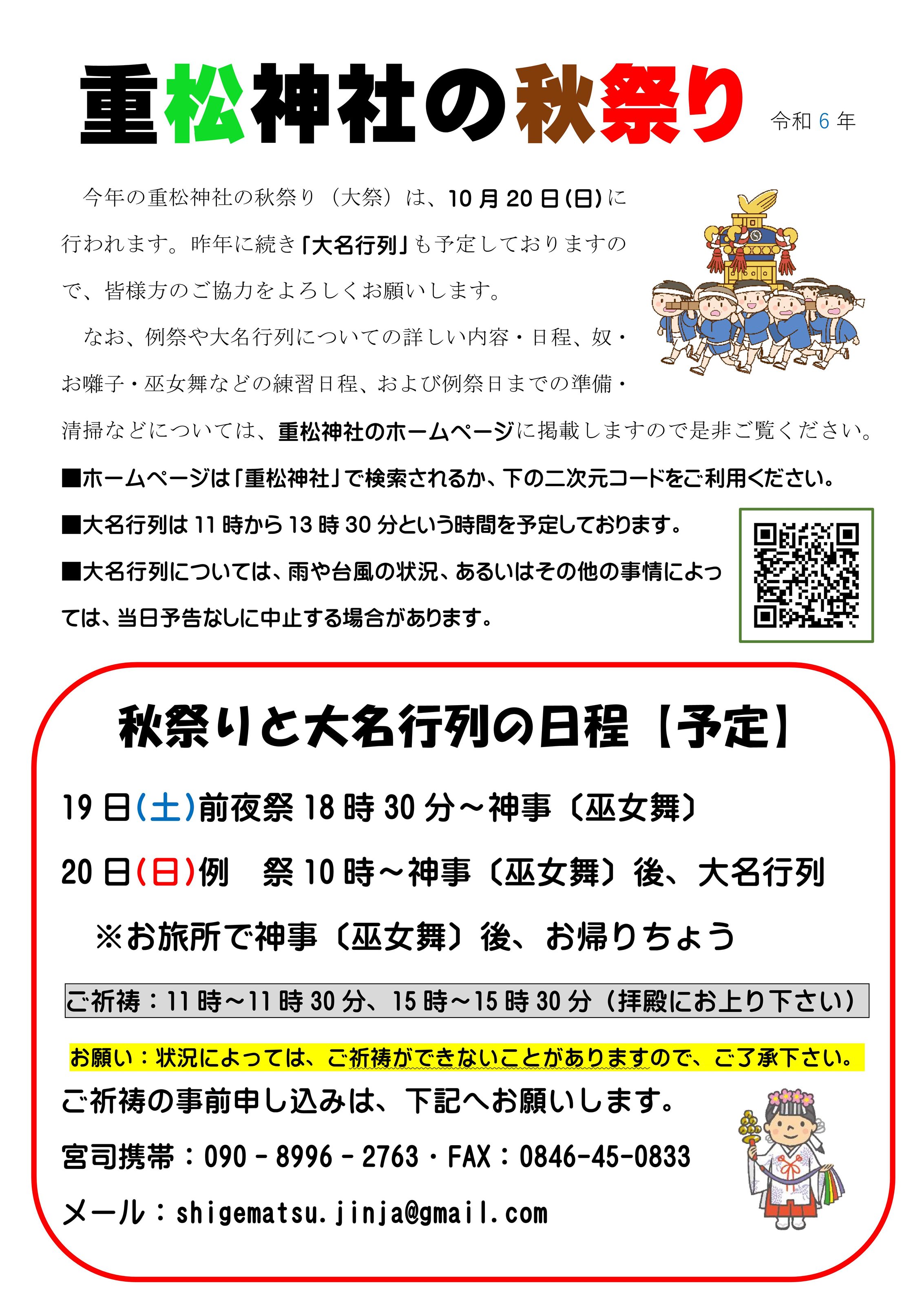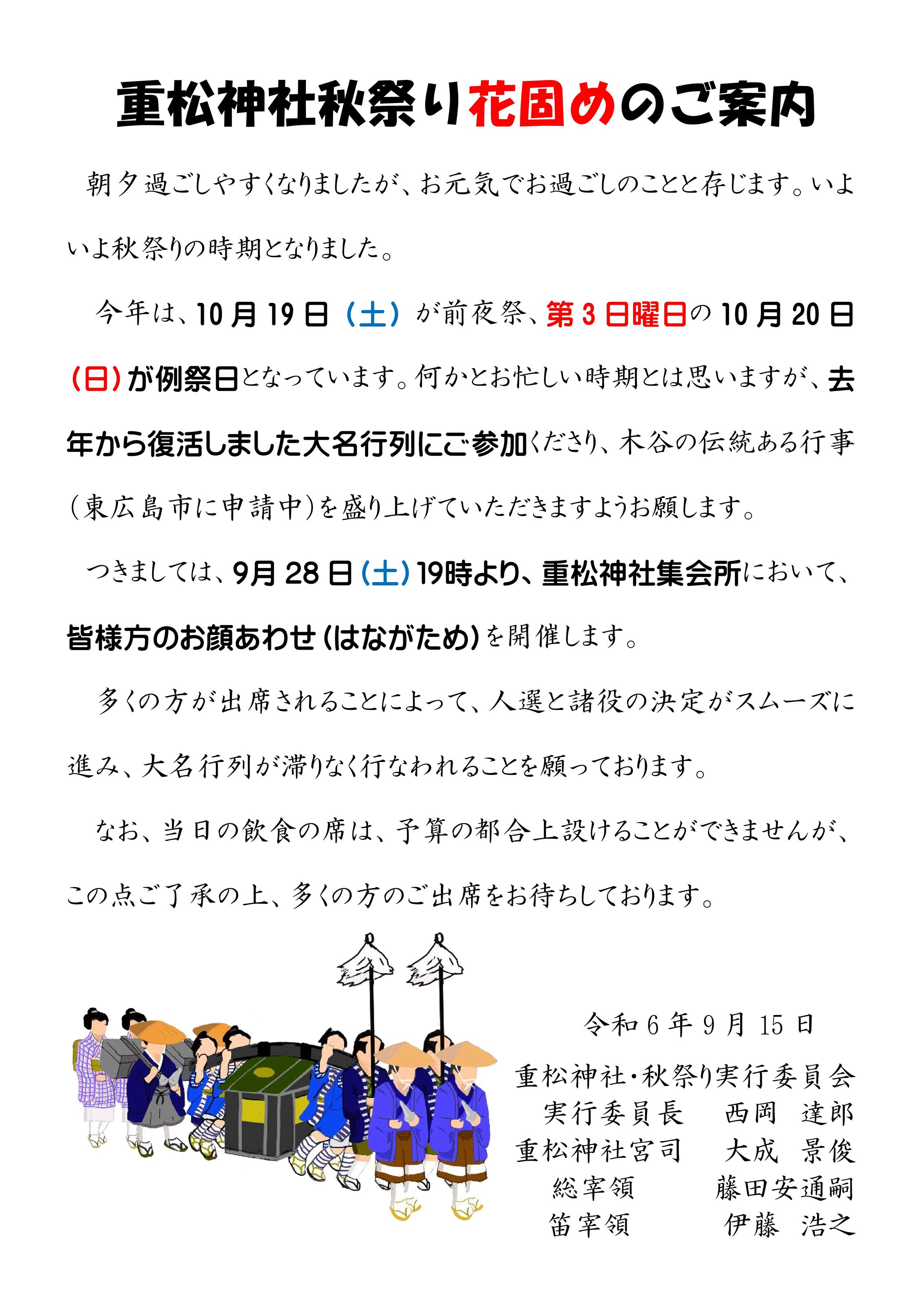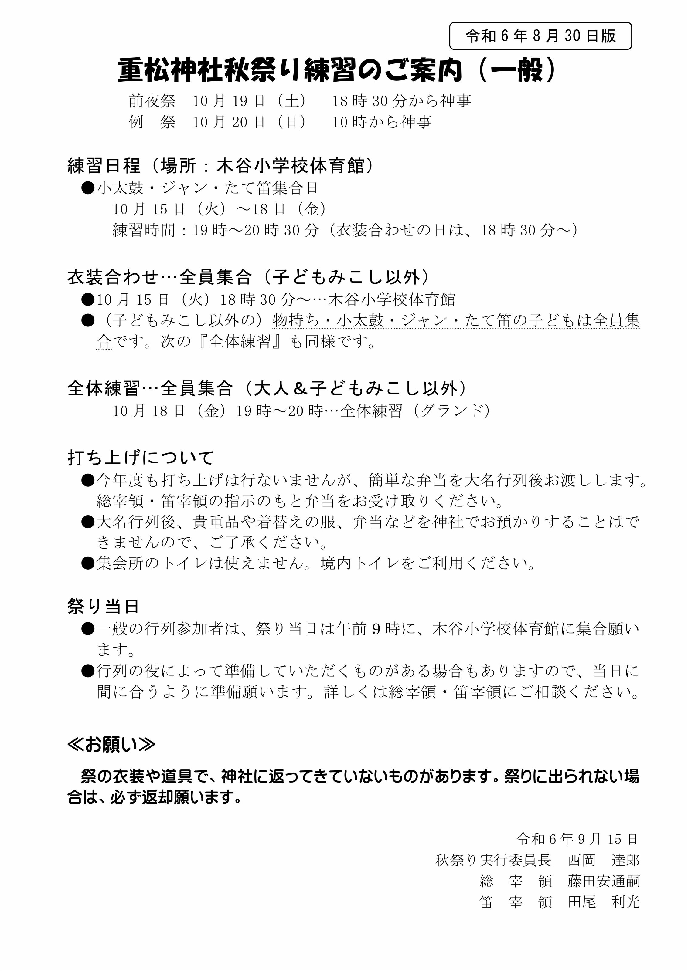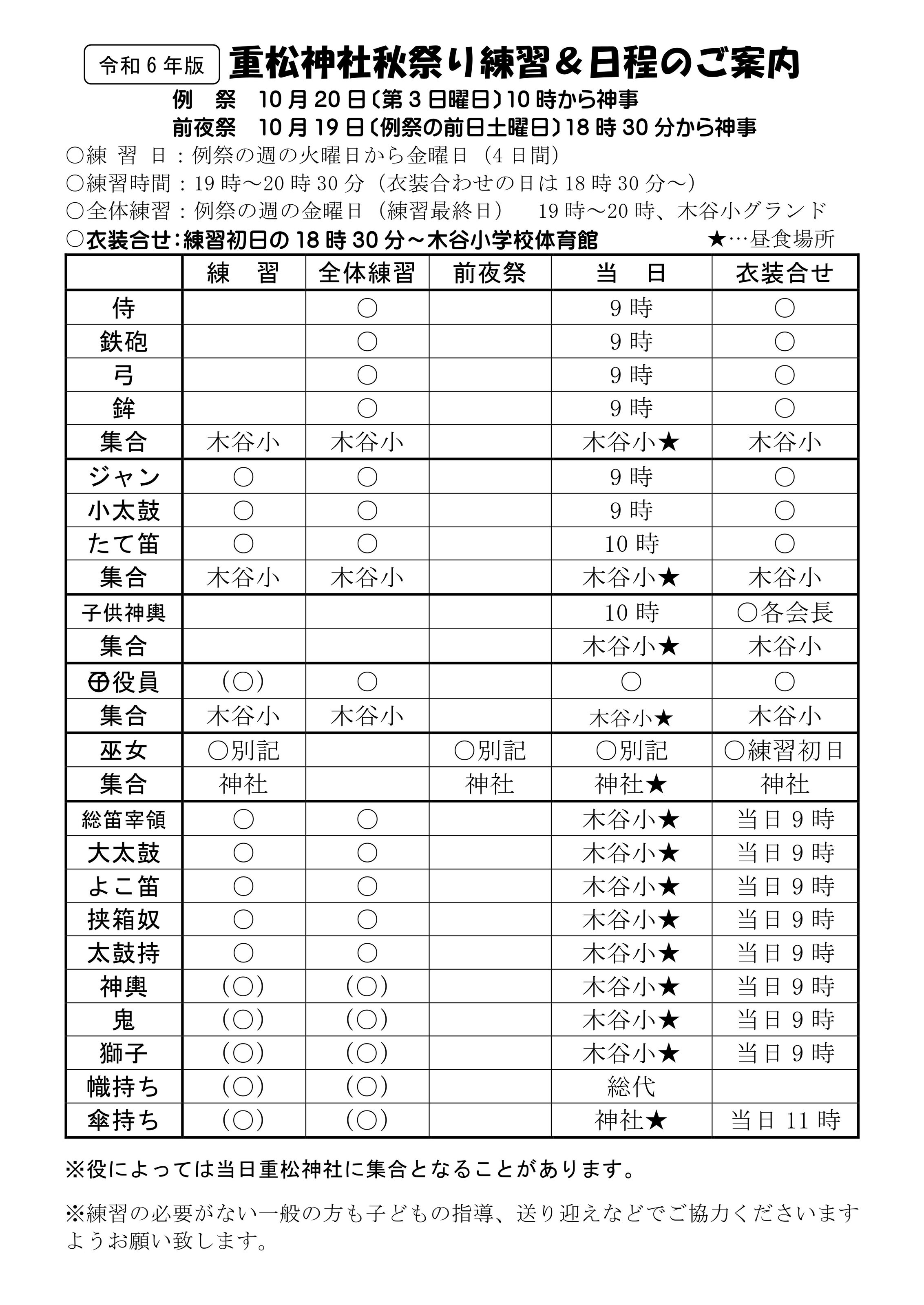 このページは、令和6年度の秋祭りの日程や大名行列の練習などについて掲載しています。知りたい情報については、「目次」をクリックして探してみてください。