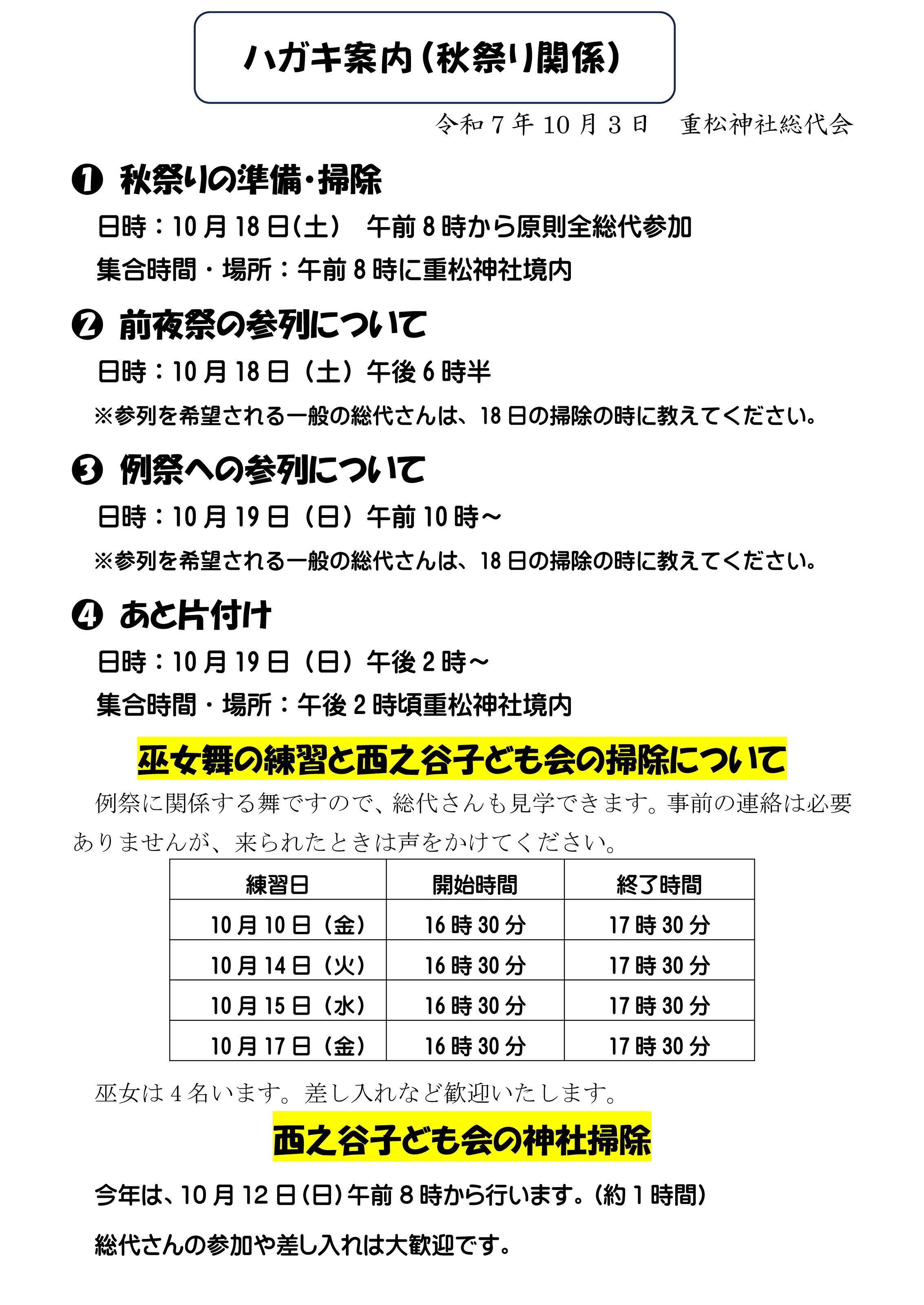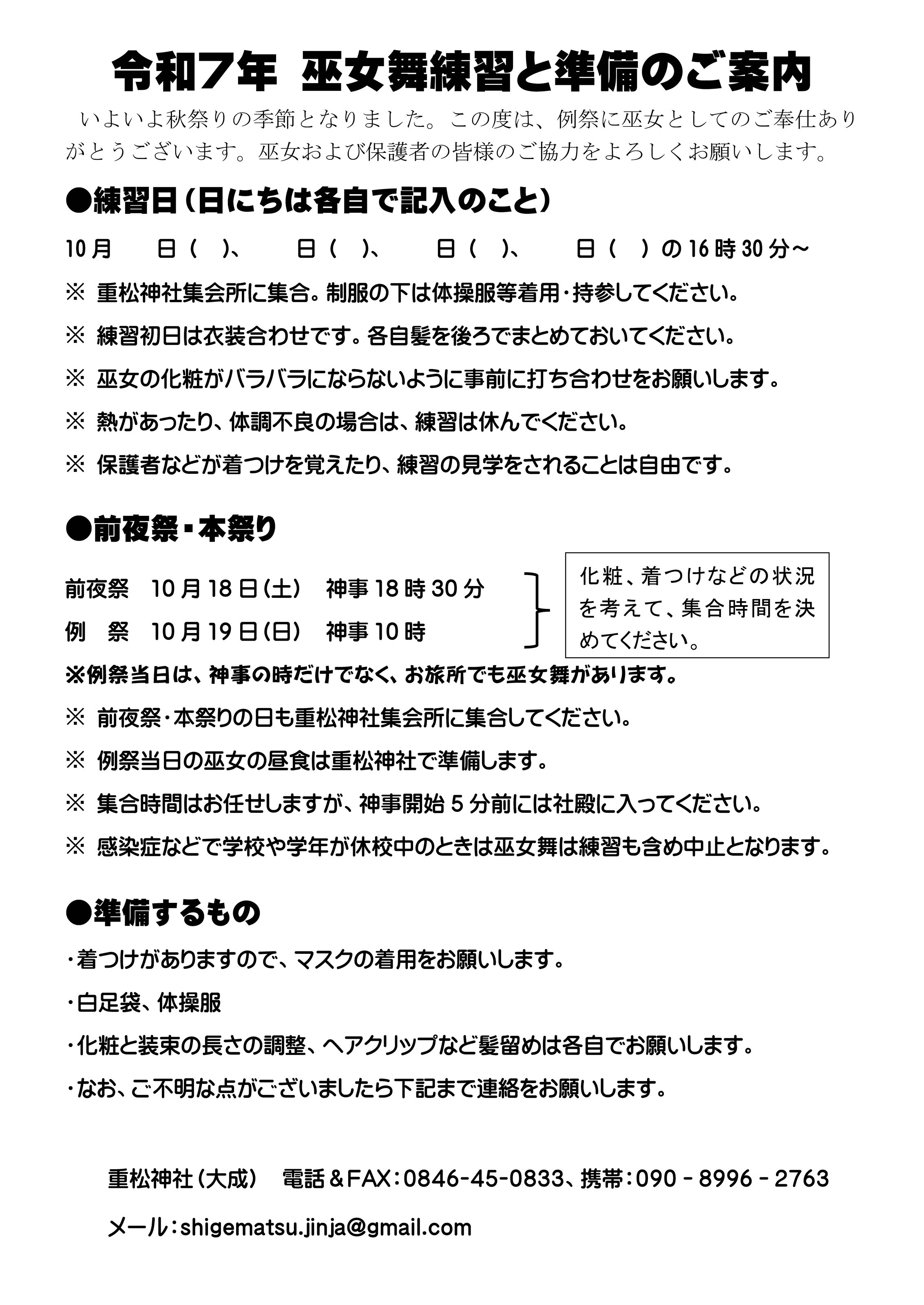 前夜祭・・・令和7年10月18日〔土〕18時30分~神事例 祭・・・令和7年10月19日〔日〕10時~神事