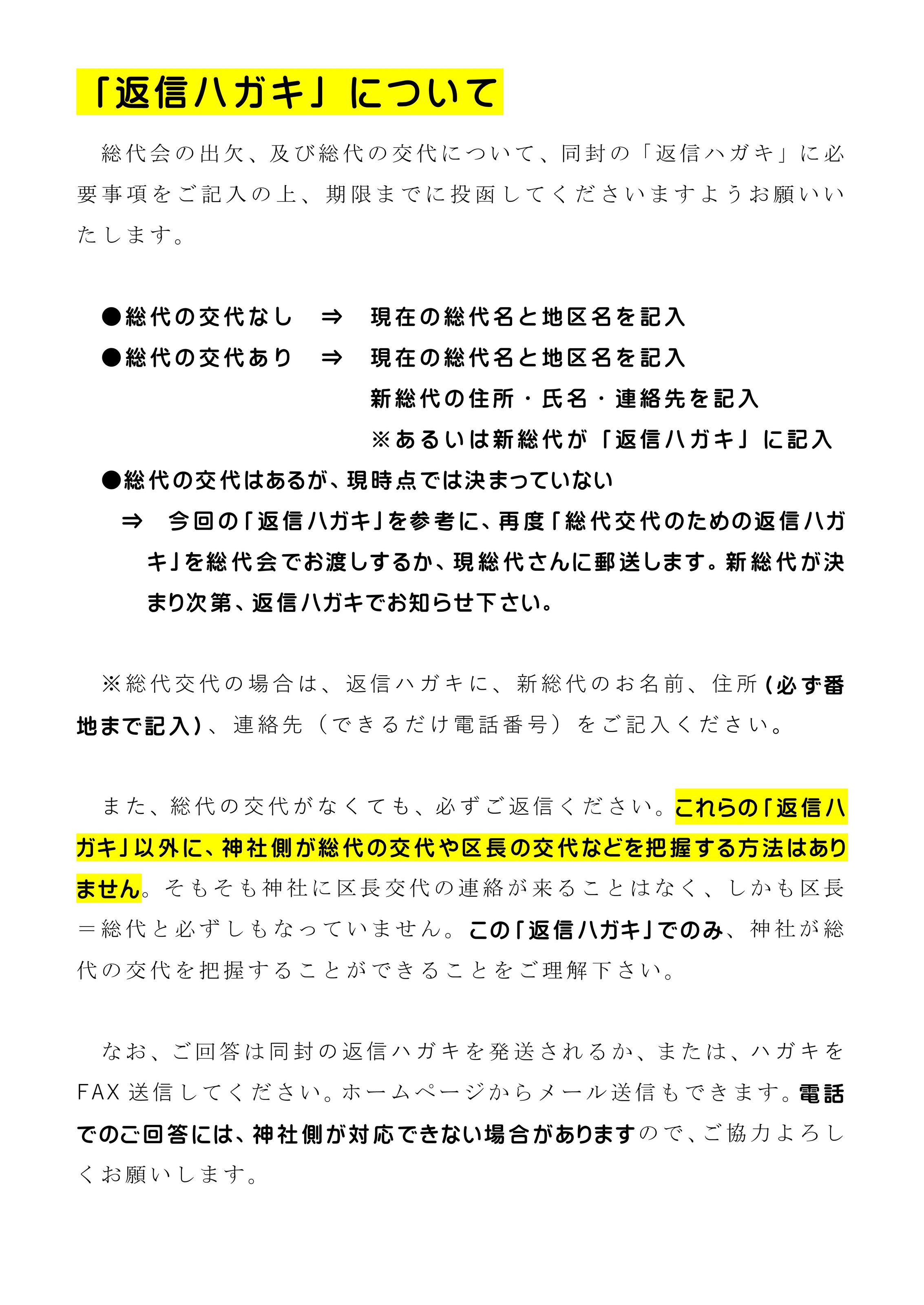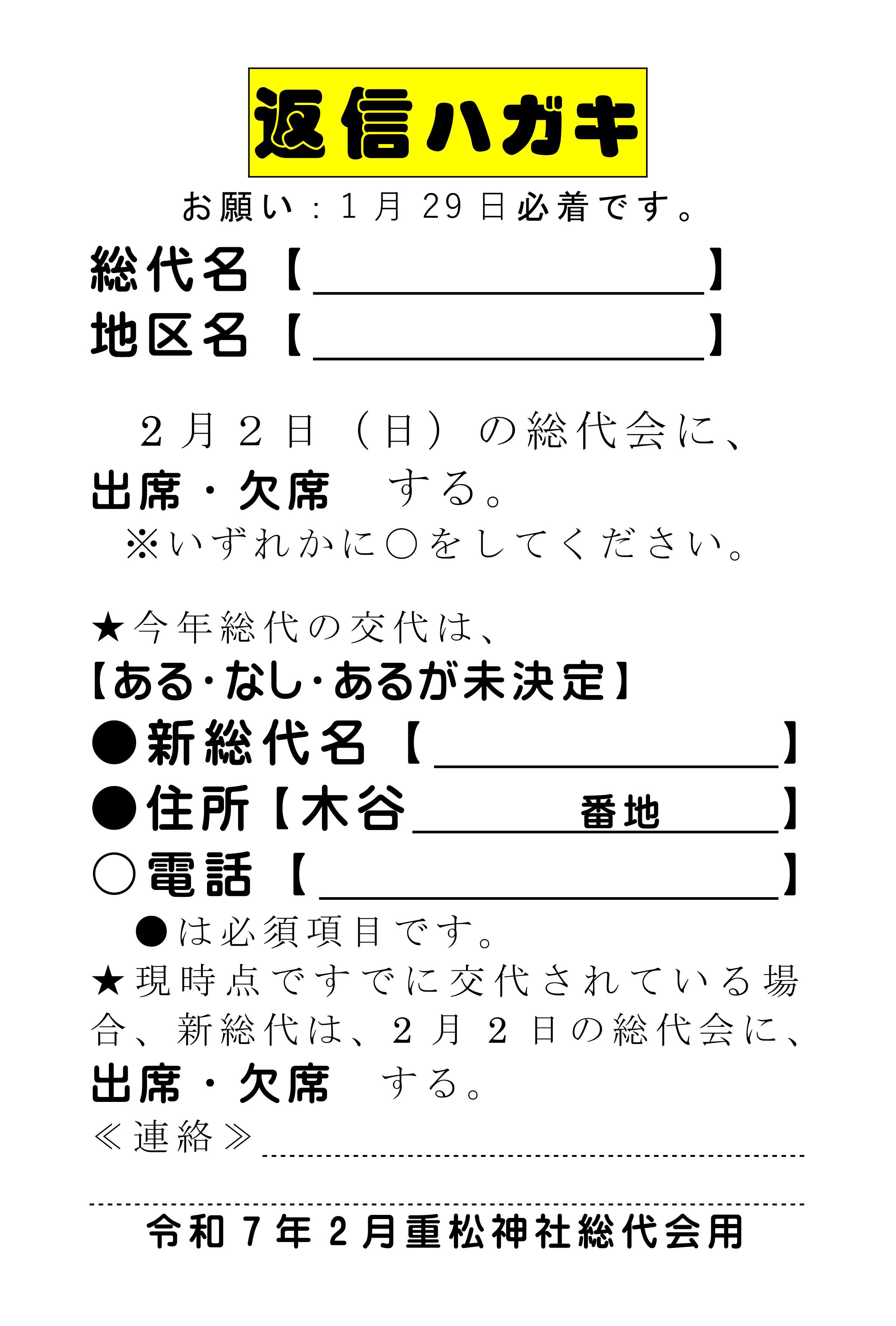 1月10日に、次の総代会案内と「黄色の返信ハガキ」を発送していますので、よろしくお願いします。